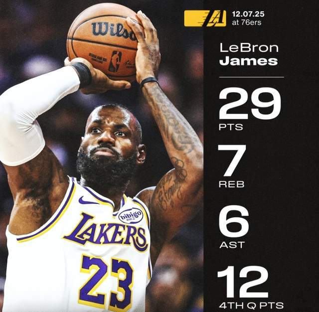 全场比赛詹姆斯上场34分钟,17投12中,得到29分7篮板6助攻,得分创下赛季新高,而在末节独砍12分。这一次詹姆斯也是创下3大纪录,生涯常规赛总胜场来到历史第二的位置,只落后贾巴尔;这也是他40岁后第16次单场至少轰下25分5篮板5助攻,高居历史第一;单场29分也是刷新球员第23个赛季的得分新高。