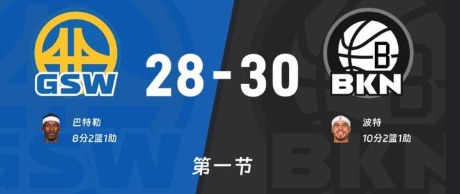 波特连续三分不中,佩顿连得5分帮助勇士缓过来一口气,克洛克不信邪三分继续顶投,这次有了。追梦传球被断,小波特空切轻松上篮,23-13分差重新回到10分。5分11秒托马斯替补上来,库里险些被断球权还在手里,佩顿压哨抛投不中,转换过来杰明三分又是大空位轻松投中,勇士又是掩护犯规克拉克斯顿轻松吃掉TJD,桑托斯助攻TJD暴扣,杰明运球被梅尔顿抢断一条龙上篮17-28这次篮网暂停了,科尔就该多用用体能充沛的球员!比赛回来篮网第一次进攻没有打成,波杰姆斯基中距离跳投得分,托马斯跳投不中球出界了篮网要挑战这个球权,回到比赛挑战成功了,托马斯传球直接失误,波杰姆斯基突破抛投小了,转换回来托马斯突破内线得手分差来到9分。第一节最后两分钟关键时刻巴特勒、TJD持续造杀伤,联手打了篮网一波7-0帮助勇士将比分追到28-30结束首节!