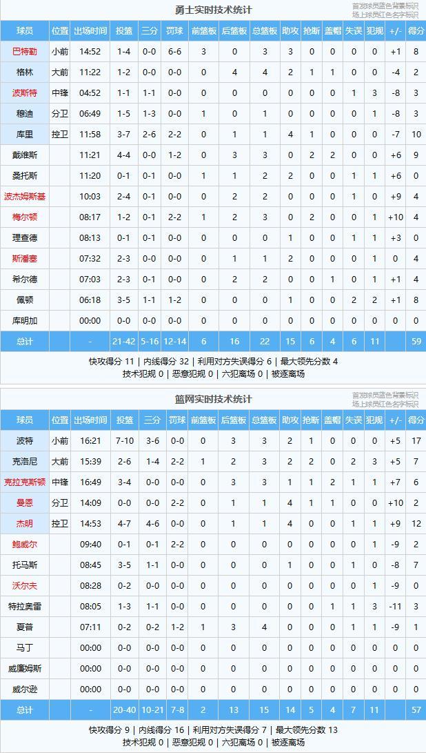 篮网:波特17分3板2助、杰明12分1板4助、克洛尼7分3板2助2断、托马斯7分1助、克拉克斯顿6分3板1助2帽、特拉奥雷3分、曼恩2分1板4助、鲍威尔2分、夏普1分4板